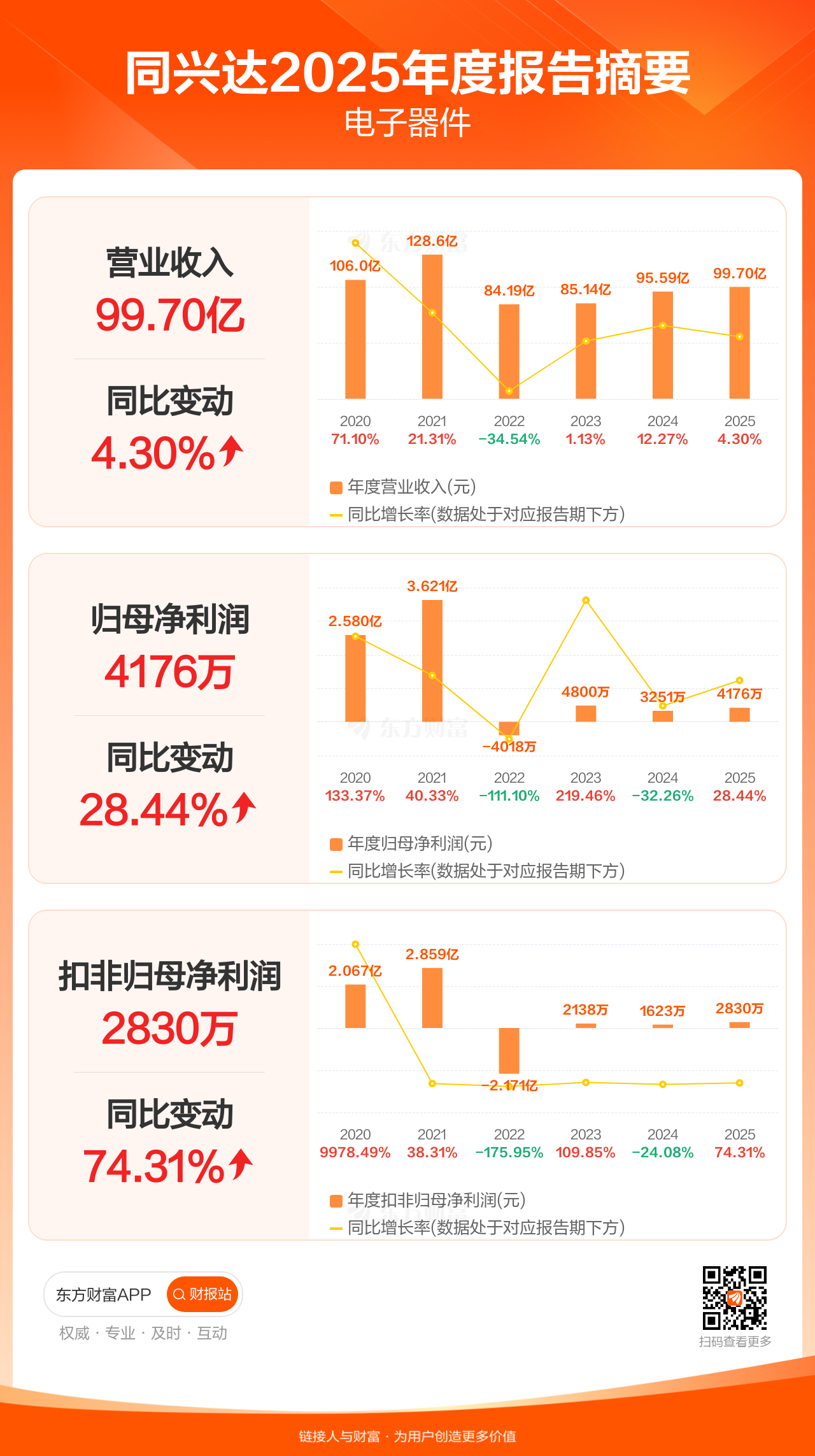同兴达4月23日发布2025年年报显示,公司全年实现营业收入99.70亿元,同比增长4.30%;归母净利润4176.23万元,同比增长28.44%;扣非归母净利润2829.83万元,同比增长74.31%。