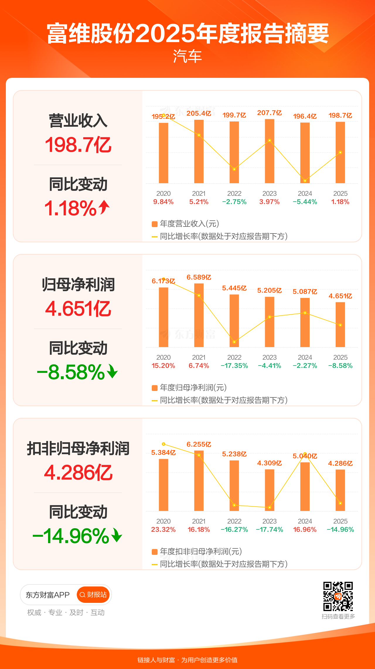 富维股份4月23日发布2025年年报显示,公司全年实现营业收入198.68亿元,同比增长1.18%;归母净利润4.65亿元,同比下滑8.58%;扣非归母净利润4.29亿元,同比下滑14.96%。