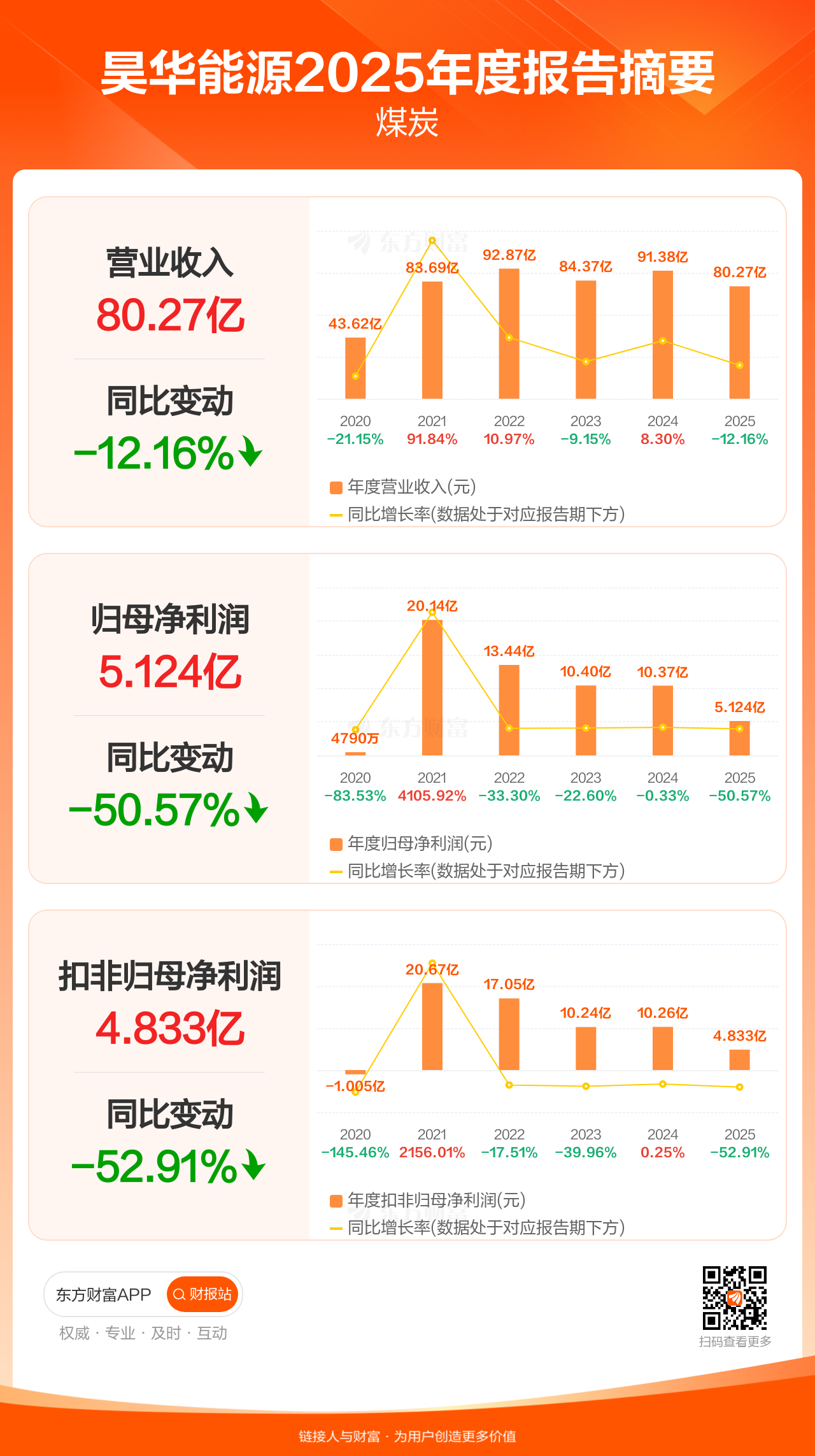 昊华能源4月23日发布2025年年报显示,公司全年实现营业收入80.27亿元,同比下滑12.16%;归母净利润5.12亿元,同比下滑50.57%;扣非归母净利润4.83亿元,同比下滑52.91%。
