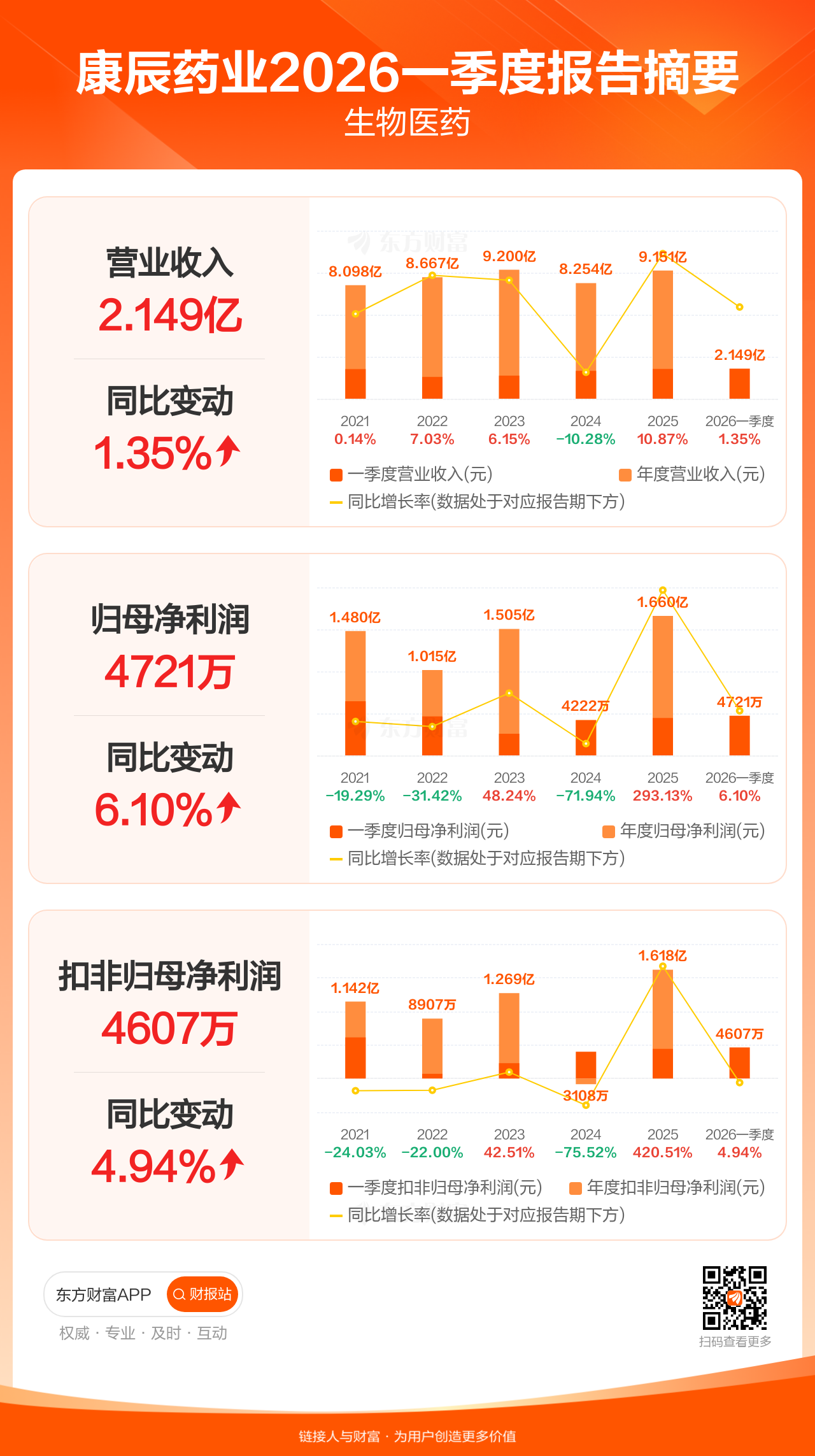 康辰药业4月23日发布2026年一季报显示,公司一季度实现营业收入2.15亿元,同比增长1.35%;归母净利润4721.36万元,同比增长6.10%;扣非归母净利润4606.66万元,同比增长4.94%。