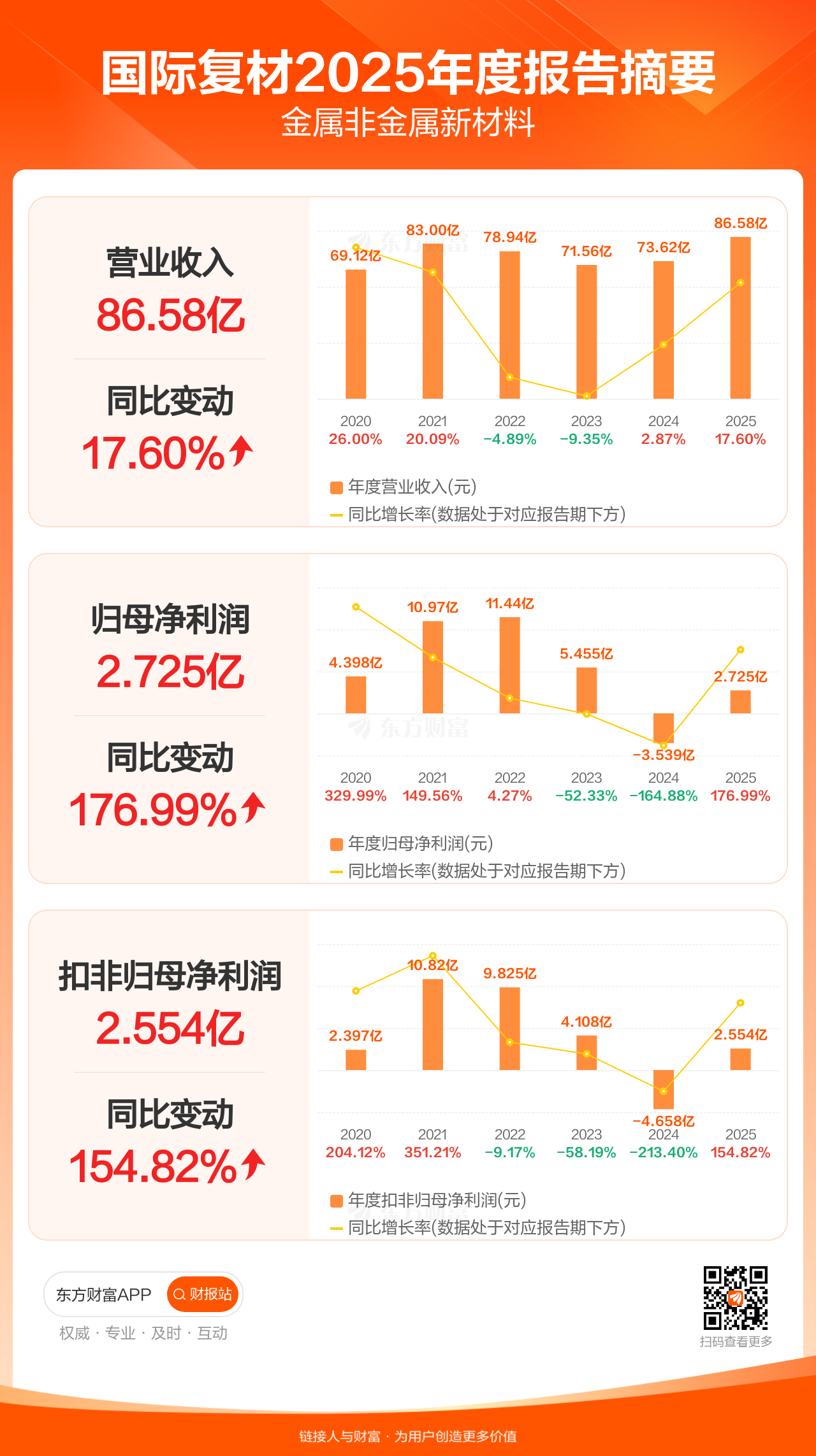 国际复材4月23日发布2025年年报显示,公司全年实现营业收入86.58亿元,同比增长17.60%;归母净利润2.72亿元,同比增长176.99%;扣非归母净利润2.55亿元,同比增长154.82%。
