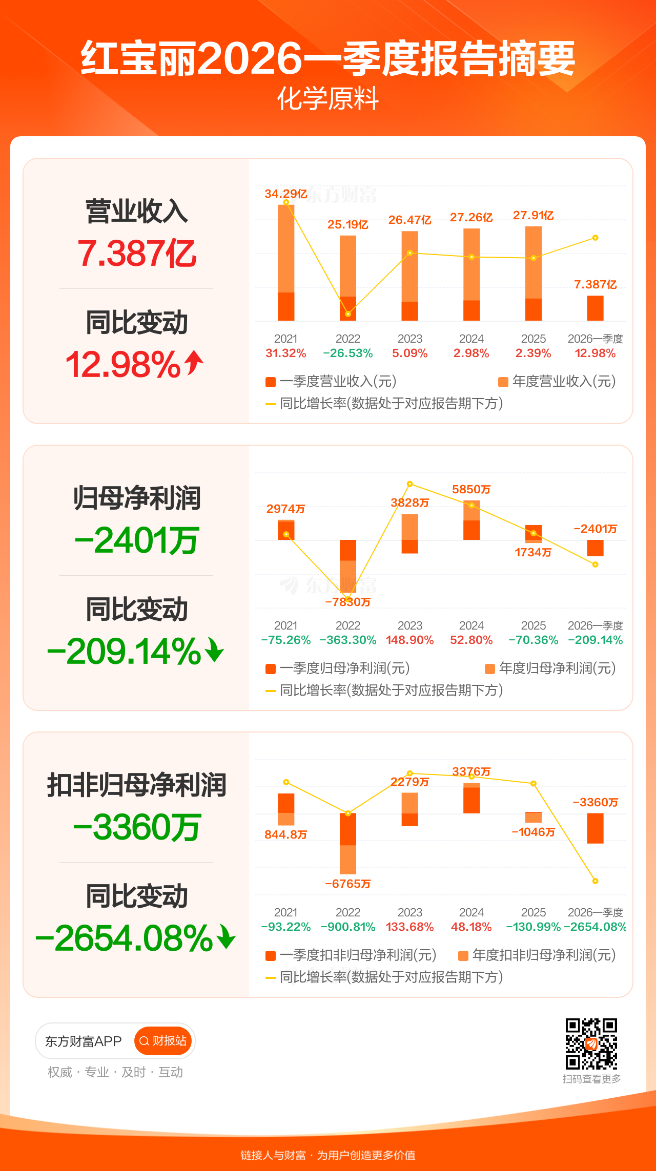 红宝丽4月23日发布2026年一季报显示,公司一季度实现营业收入7.39亿元,同比增长12.98%;归母净利润-2401.20万元;扣非归母净利润-3360.45万元。