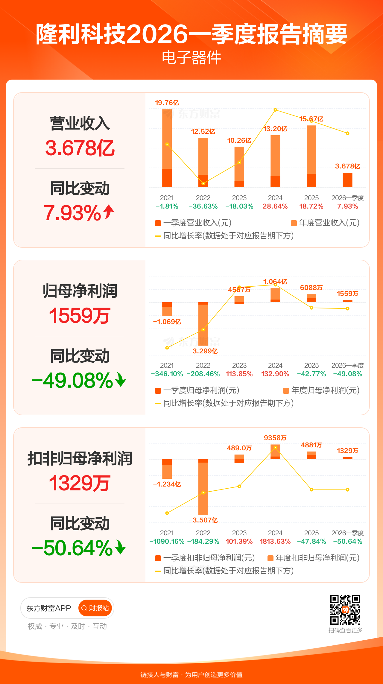 隆利科技4月23日发布2026年一季报显示,公司一季度实现营业收入3.68亿元,同比增长7.93%;归母净利润1558.61万元,同比下滑49.08%;扣非归母净利润1328.96万元,同比下滑50.64%。