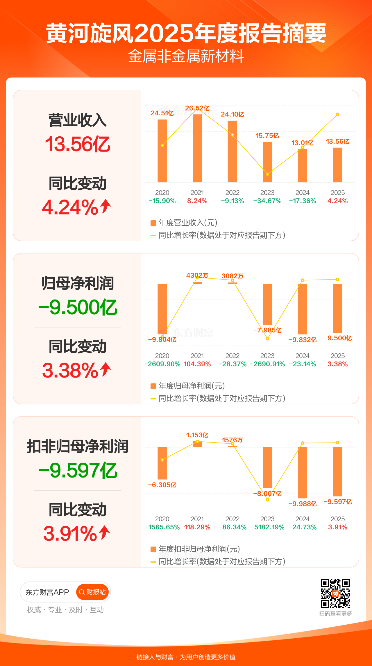 黄河旋风4月23日发布2025年年报显示,公司全年实现营业收入13.56亿元,同比增长4.24%;归母净利润-9.50亿元;扣非归母净利润-9.60亿元。