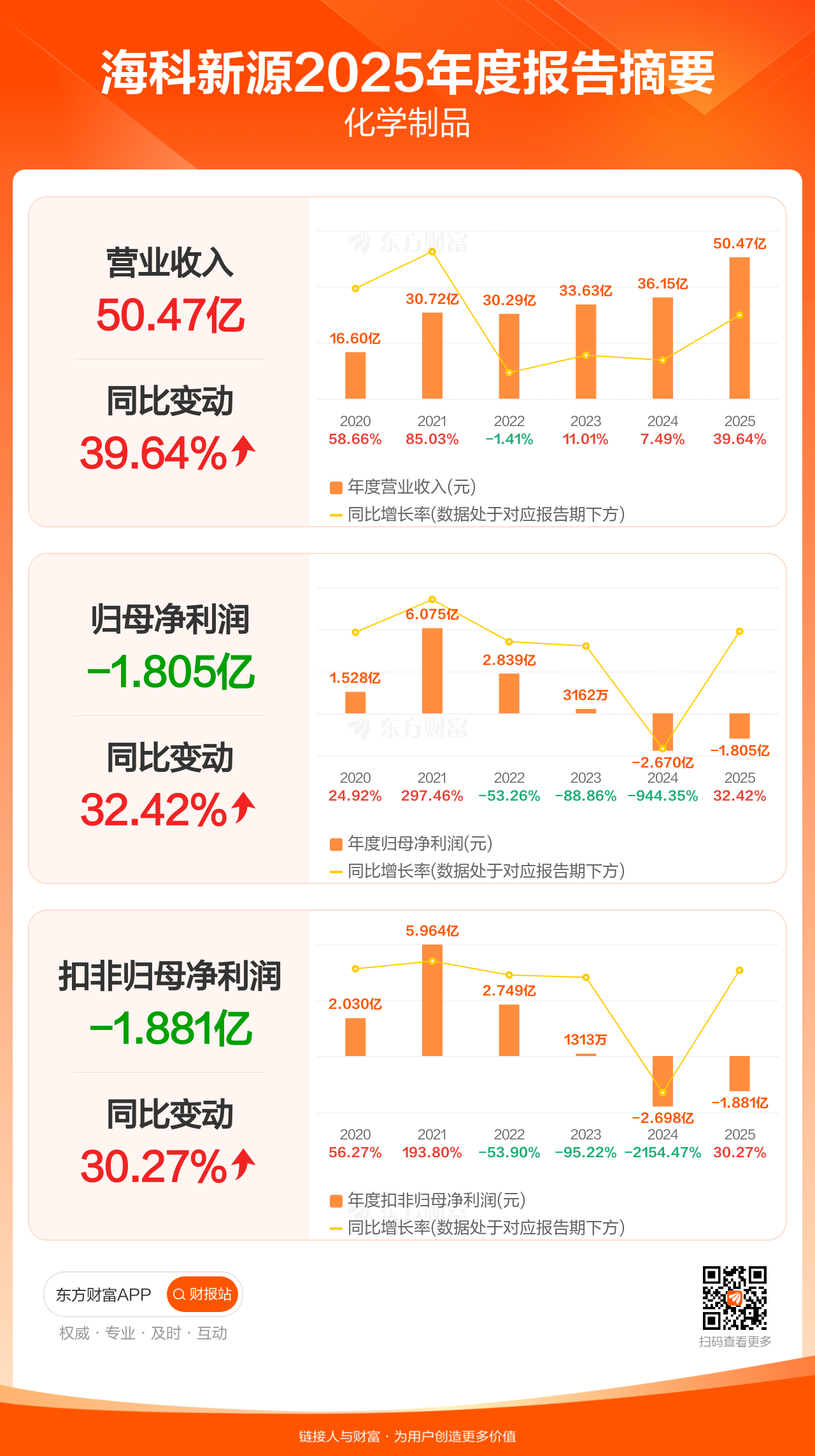 海科新源4月23日发布2025年年报显示,公司全年实现营业收入50.47亿元,同比增长39.64%;归母净利润-1.80亿元;扣非归母净利润-1.88亿元。
