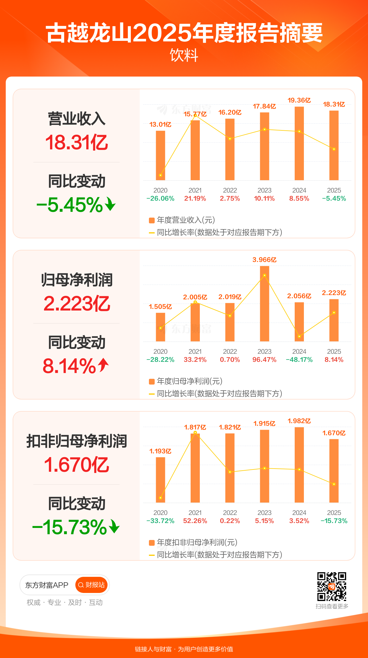 古越龙山4月23日发布2025年年报显示,公司全年实现营业收入18.31亿元,同比下滑5.45%;归母净利润2.22亿元,同比增长8.14%;扣非归母净利润1.67亿元,同比下滑15.73%。