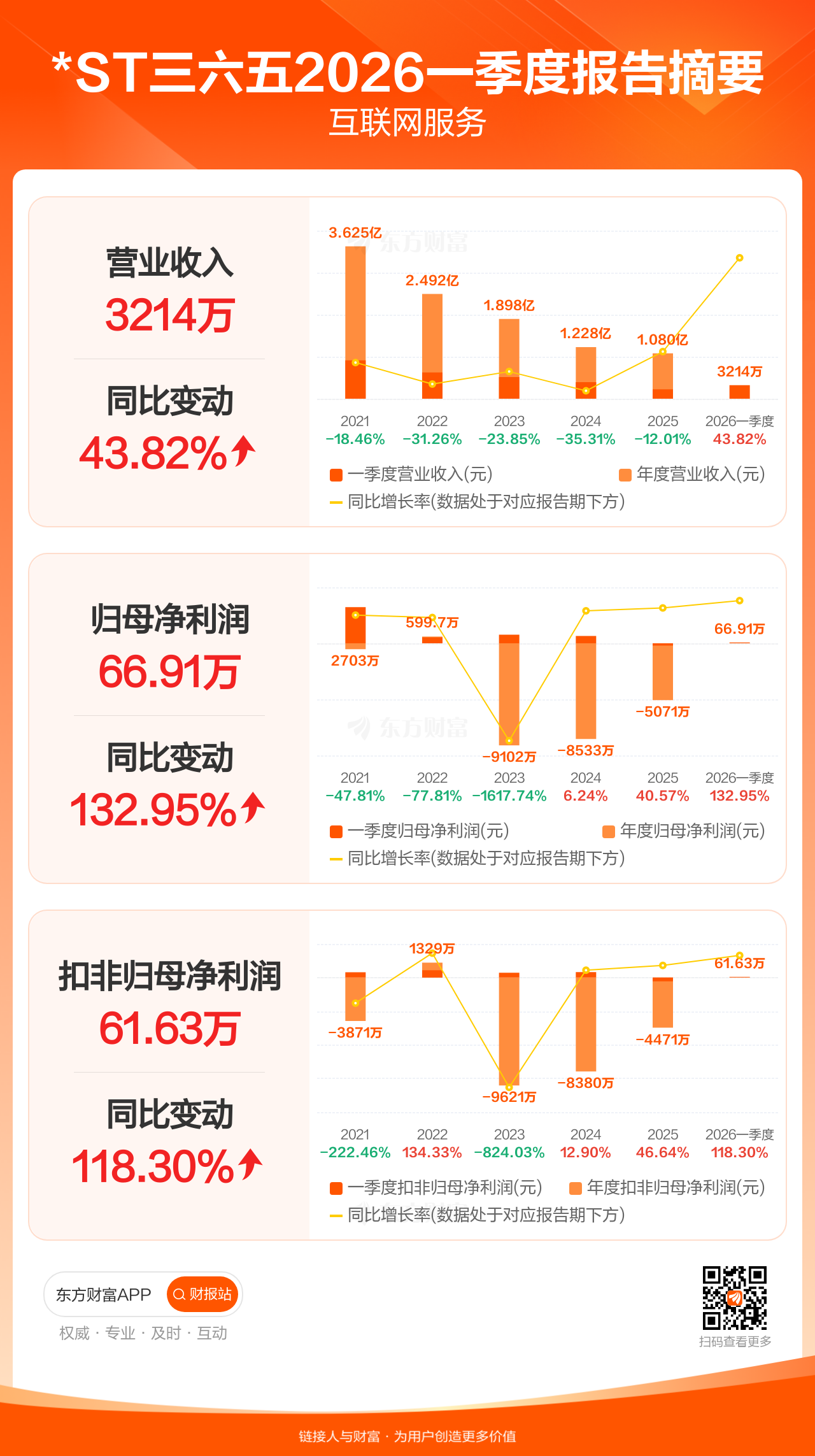 *ST三六五4月23日发布2026年一季报显示,公司一季度实现营业收入3214.17万元,同比增长43.82%;归母净利润66.91万元,同比增长132.95%;扣非归母净利润61.63万元,同比增长118.30%。