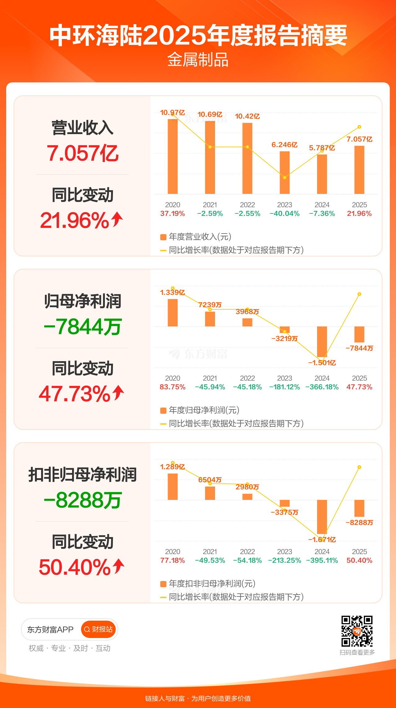 中环海陆4月23日发布2025年年报显示,公司全年实现营业收入7.06亿元,同比增长21.96%;归母净利润-7844.17万元;扣非归母净利润-8288.12万元。