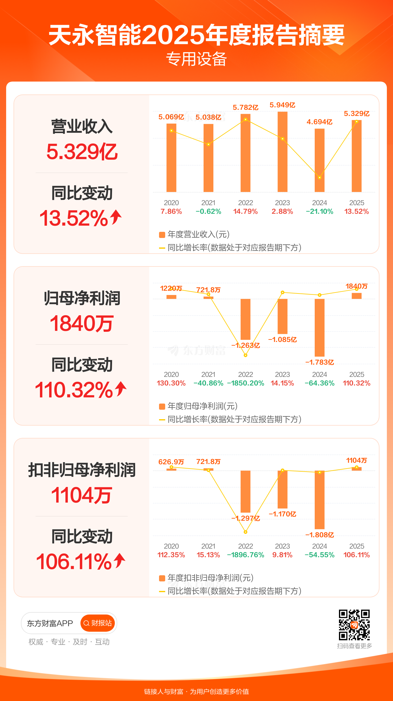 天永智能4月23日发布2025年年报显示,公司全年实现营业收入5.33亿元,同比增长13.52%;归母净利润1839.52万元,同比增长110.32%;扣非归母净利润1104.23万元,同比增长106.11%。