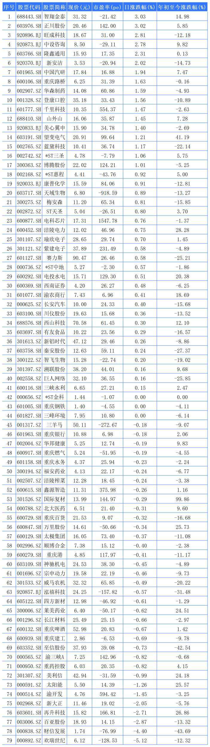 79家重庆A股上市公司中,41家上涨,3家平收,35家下跌。