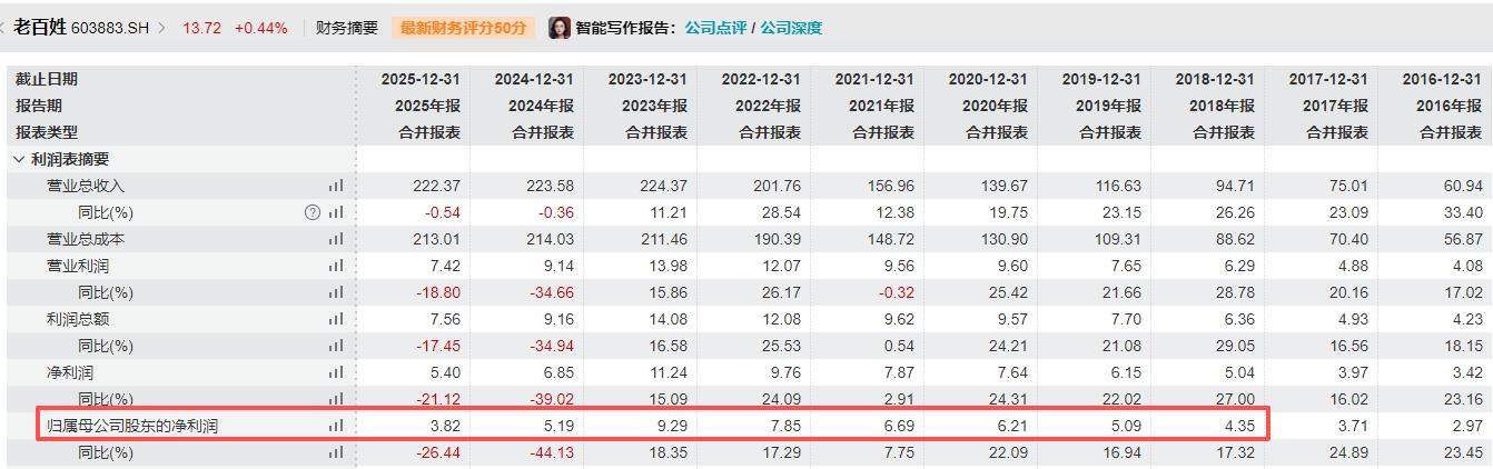 数据显示,2025年,老百姓实现营业收入222.37亿元,同比减少0.54%;归属于上市公司股东的净利润(下称“归母净利润”)3.82亿元,同比减少26.44%。
