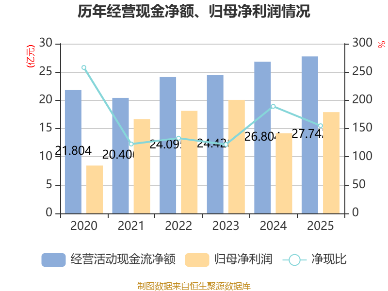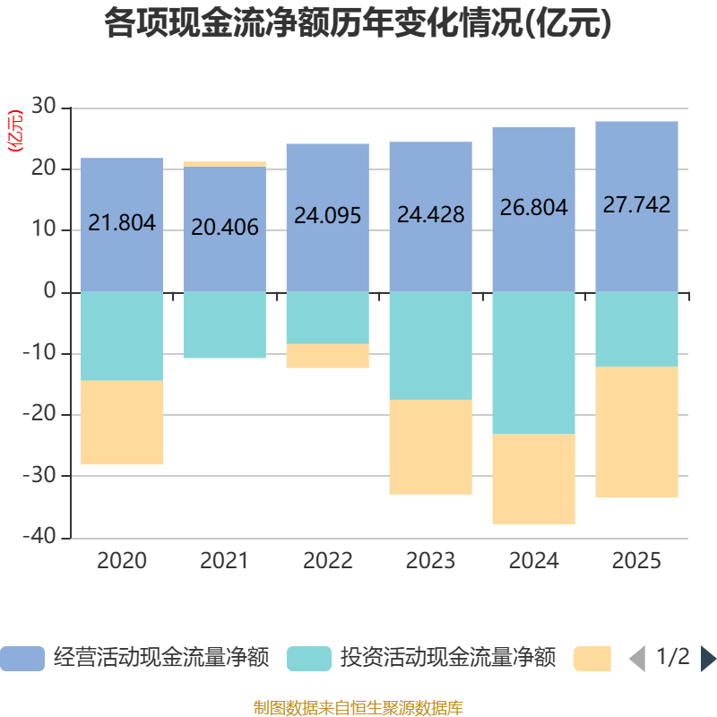 截至2025年,公司经营活动现金流净额为27.74亿元,同比增长3.5%;筹资活动现金流净额-21.3亿元,同比减少6.64亿元;投资活动现金流净额-12.15亿元,上年同期为-23.16亿元。