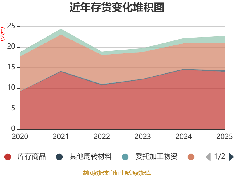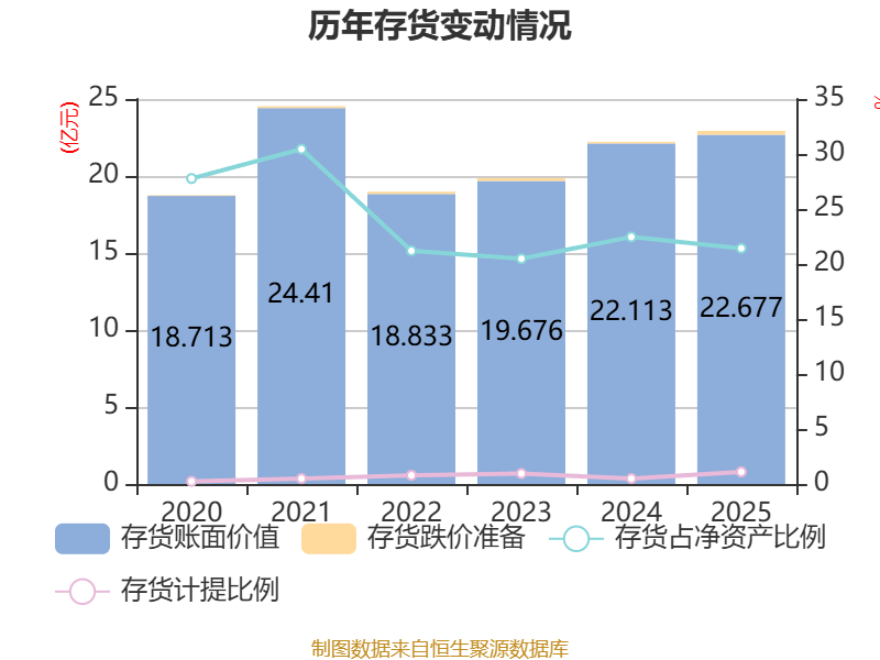 从存货变动来看,截至2025年末,公司存货账面价值为22.68亿元,占净资产的21.42%,较上年末增加5633.64万元。其中,存货跌价准备为2530.82万元,计提比例为1.1%。