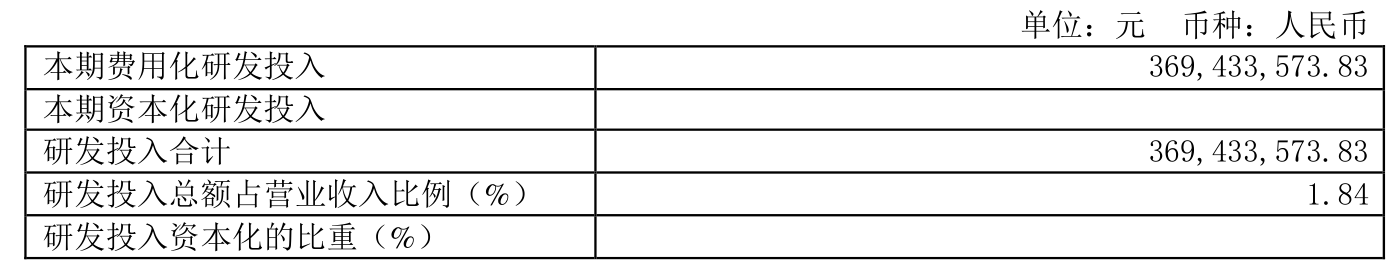 2025年全年,公司研发投入金额为3.69亿元,同比增长31.19%;研发投入占营业收入比例为1.84%,相比上年同期上升0.32个百分点。此外,公司全年研发投入资本化率为0%。