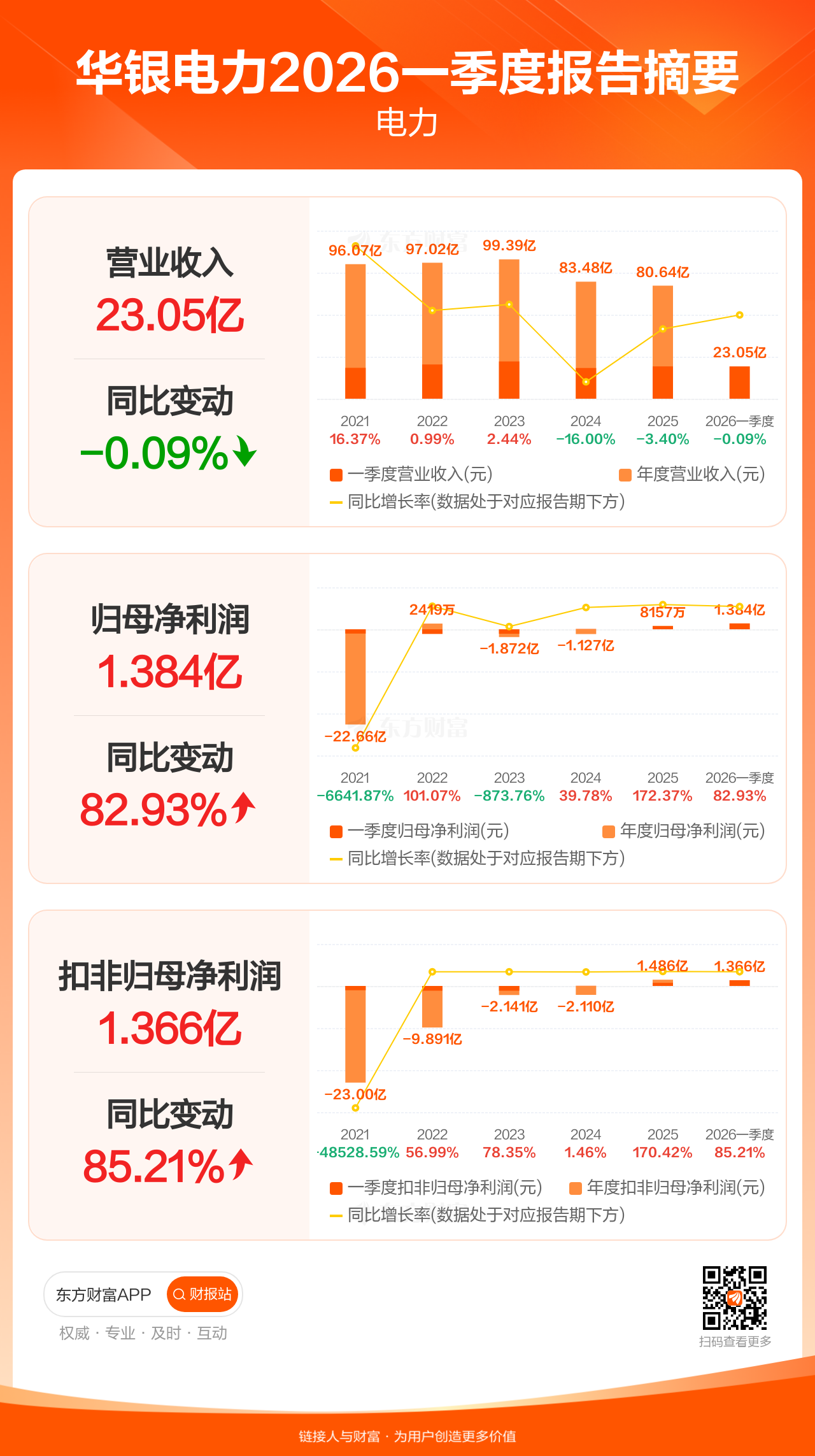华银电力4月23日发布2026年一季报显示,公司一季度实现营业收入23.05亿元,同比下滑0.09%;归母净利润1.38亿元,同比增长82.93%;扣非归母净利润1.37亿元,同比增长85.21%。