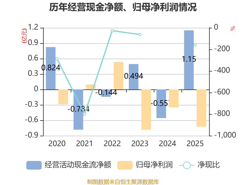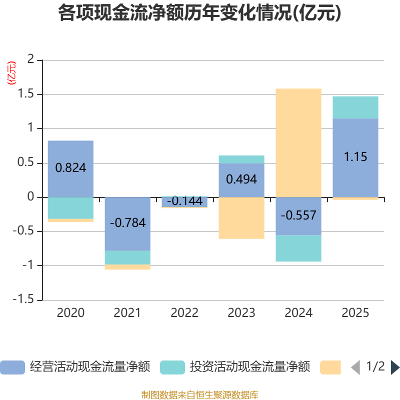 截至2025年,公司经营活动现金流净额为1.15亿元,同比增加1.71亿元;筹资活动现金流净额-390.45万元,同比减少1.62亿元;投资活动现金流净额3204.38万元,上年同期为-3828.58万元。