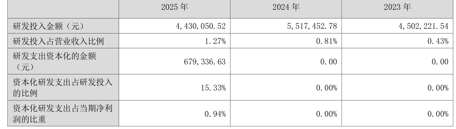 2025年全年,公司研发投入金额为443.01万元,同比下降19.71%;研发投入占营业收入比例为1.27%,相比上年同期上升0.46个百分点。此外,公司全年研发投入资本化率为15.33%。