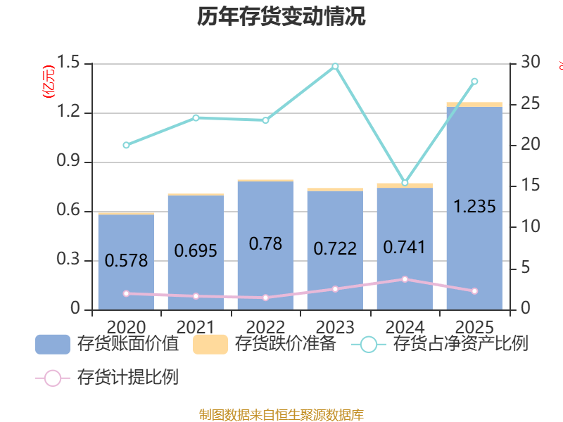 从存货变动来看,截至2025年末,公司存货账面价值为1.24亿元,占净资产的27.8%,较上年末增加4948.92万元。其中,存货跌价准备为283.66万元,计提比例为2.24%。