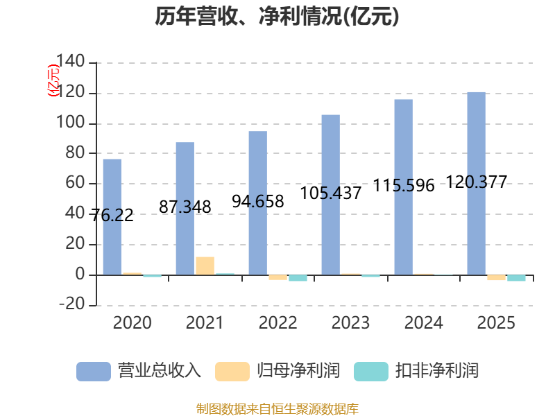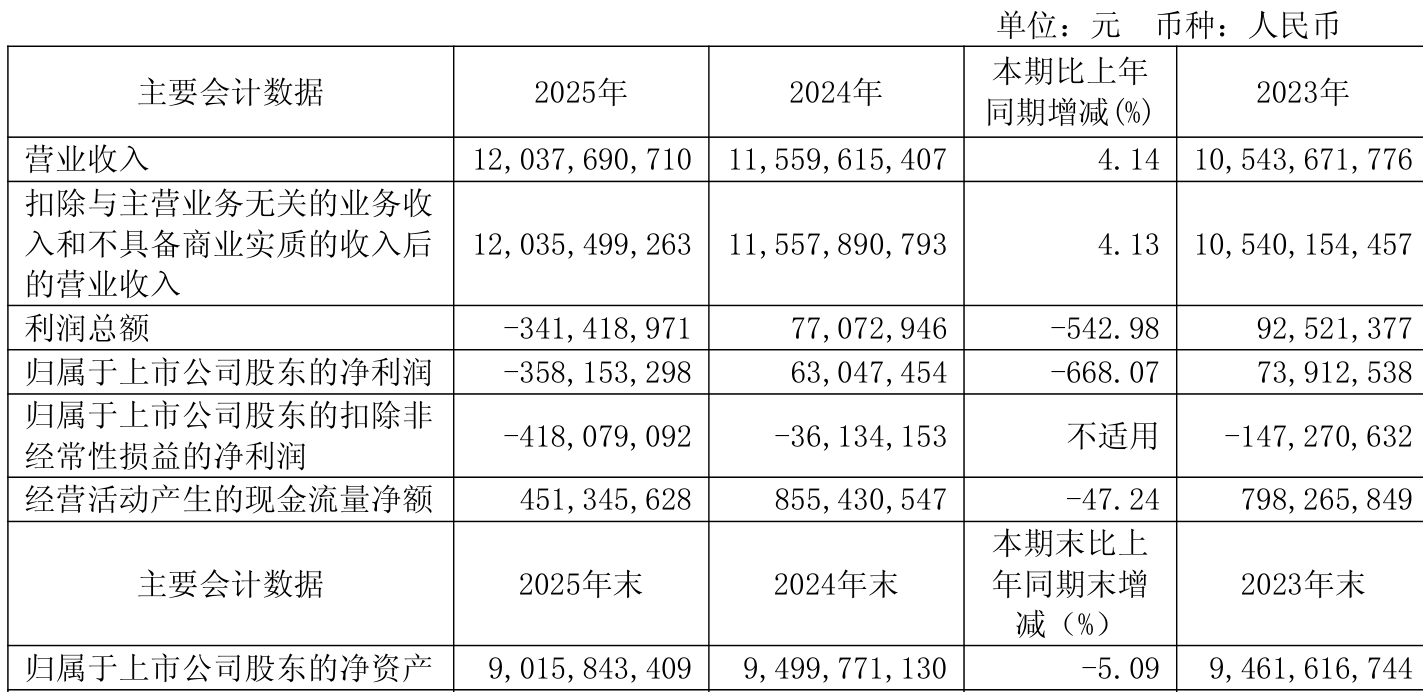 中证智能财讯东软集团(600718)4月23日披露2025年年度报告。2025年,公司实现营业总收入120.38亿元,同比增长4.14%;归母净利润亏损3.58亿元,上年同期盈利6304.75万元;扣非净利润亏损4.18亿元,上年同期亏损3613.42万元;经营活动产生的现金流量净额为4.51亿元,同比下降47.24%;报告期内,东软集团基本每股收益为-0.31元,加权平均净资产收益率为-3.88%。