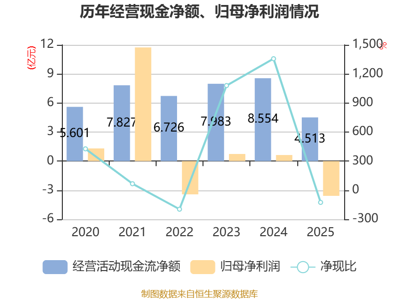 截至2025年,公司经营活动现金流净额为4.51亿元,同比下降47.24%;筹资活动现金流净额-2.77亿元,同比增加1.29亿元;投资活动现金流净额-4.76亿元,上年同期为2401.33万元。