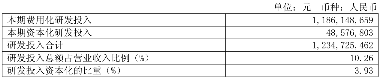 2025年全年,公司研发投入金额为12.35亿元,同比增长34.07%;研发投入占营业收入比例为10.26%,相比上年同期上升2.29个百分点。此外,公司全年研发投入资本化率为3.93%。
