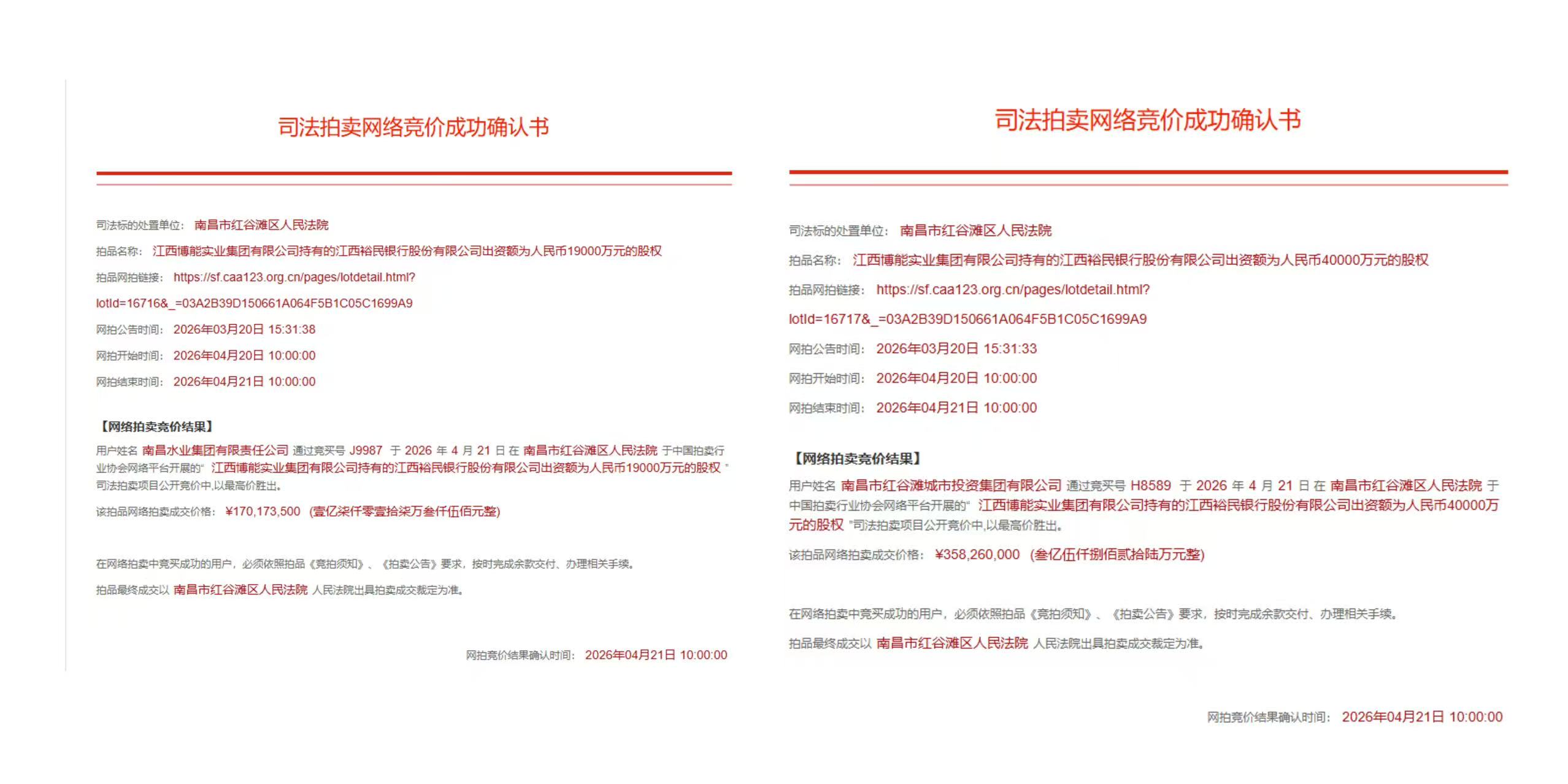 4月22日,上海证券报记者从中拍网司法拍卖平台获悉,江西博能实业集团(简称:博能实业)持有的江西裕民银行(简称:裕民银行)5.9亿股股权拍卖靴子落地。