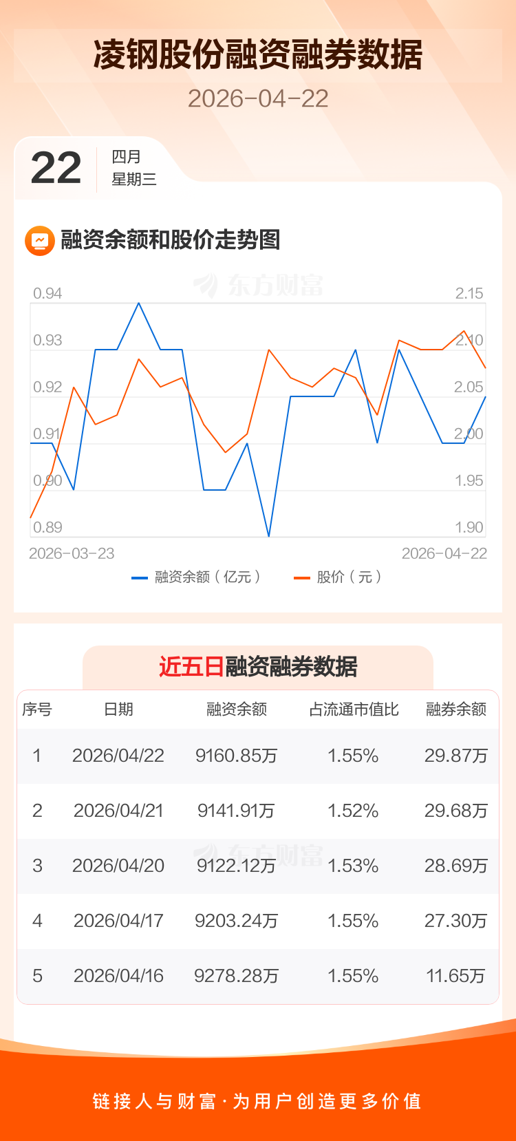 交易所最新数据显示,凌钢股份于2026年4月22日获融资买入287.99万元,融资偿还269.04万元,当日融资净买入18.95万元。目前,该股融资余额9160.85万,占流通市值比例为1.55%。