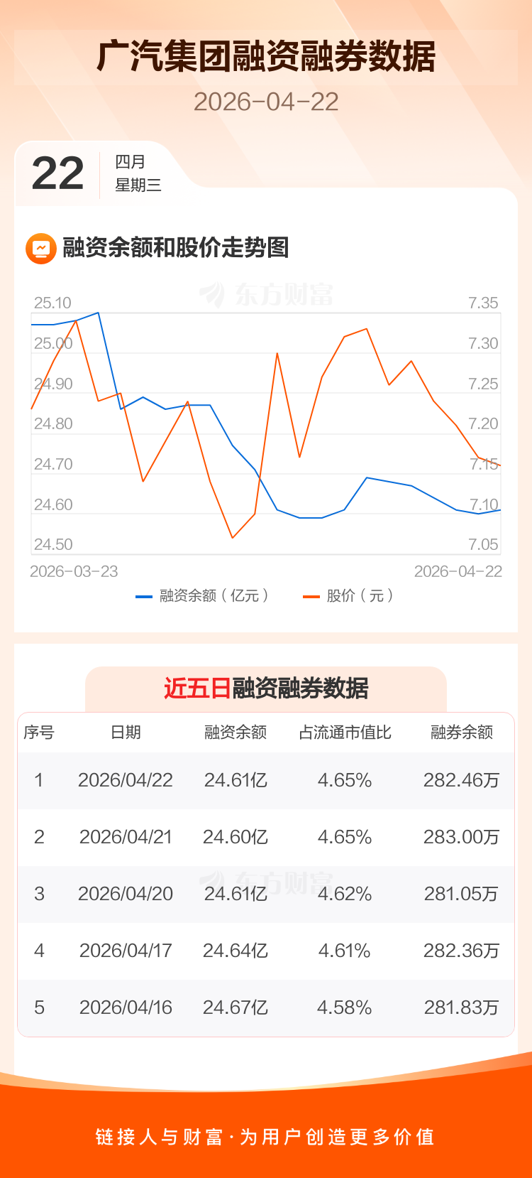 交易所最新数据显示,广汽集团于2026年4月22日获融资买入699.34万元,融资偿还610.34万元,当日融资净买入88.99万元。目前,该股融资余额24.61亿,占流通市值比例为4.65%。