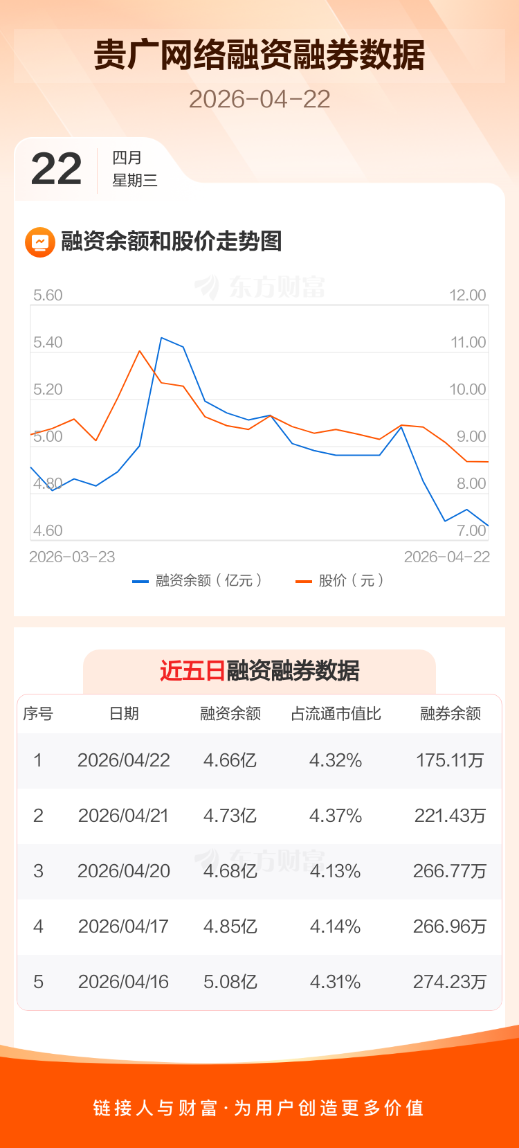 交易所最新数据显示,贵广网络于2026年4月22日获融资买入2120.34万元,融资偿还2757.81万元,当日融资净偿还637.47万元。目前,该股融资余额4.66亿,占流通市值比例为4.32%。