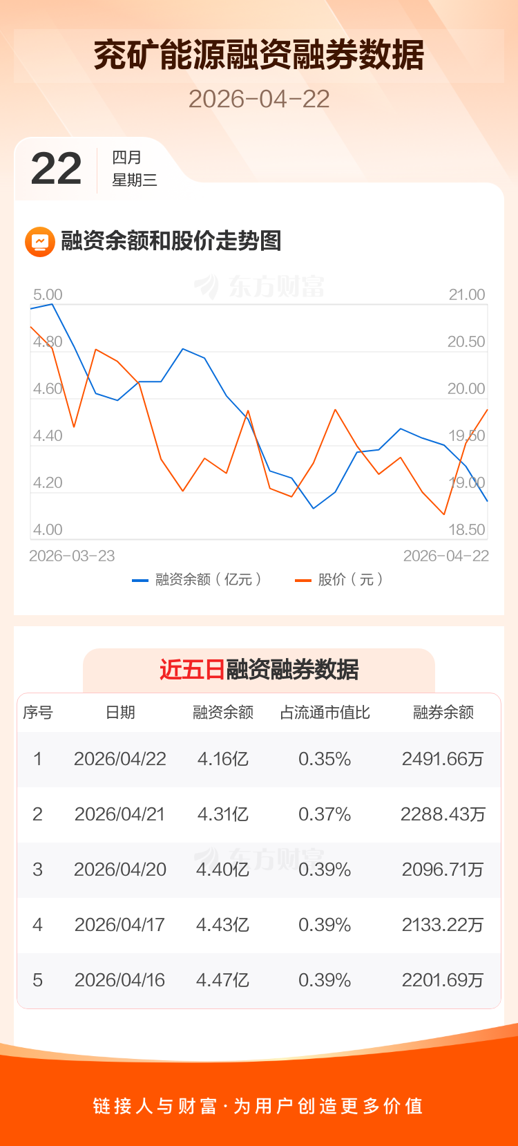 交易所最新数据显示,兖矿能源于2026年4月22日获融资买入4170.18万元,融资偿还5671.39万元,当日融资净偿还1501.2万元。目前,该股融资余额4.16亿,占流通市值比例为0.35%。