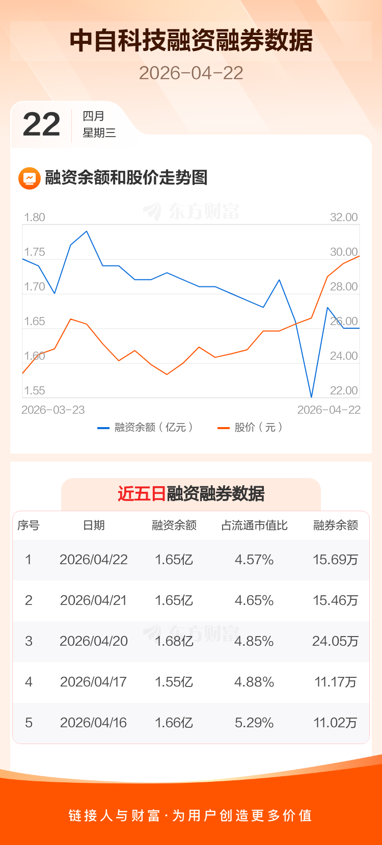 交易所最新数据显示,中自科技于2026年4月22日获融资买入727.10万元,融资偿还773.86万元,当日融资净偿还46.76万元。目前,该股融资余额1.65亿,占流通市值比例为4.57%。