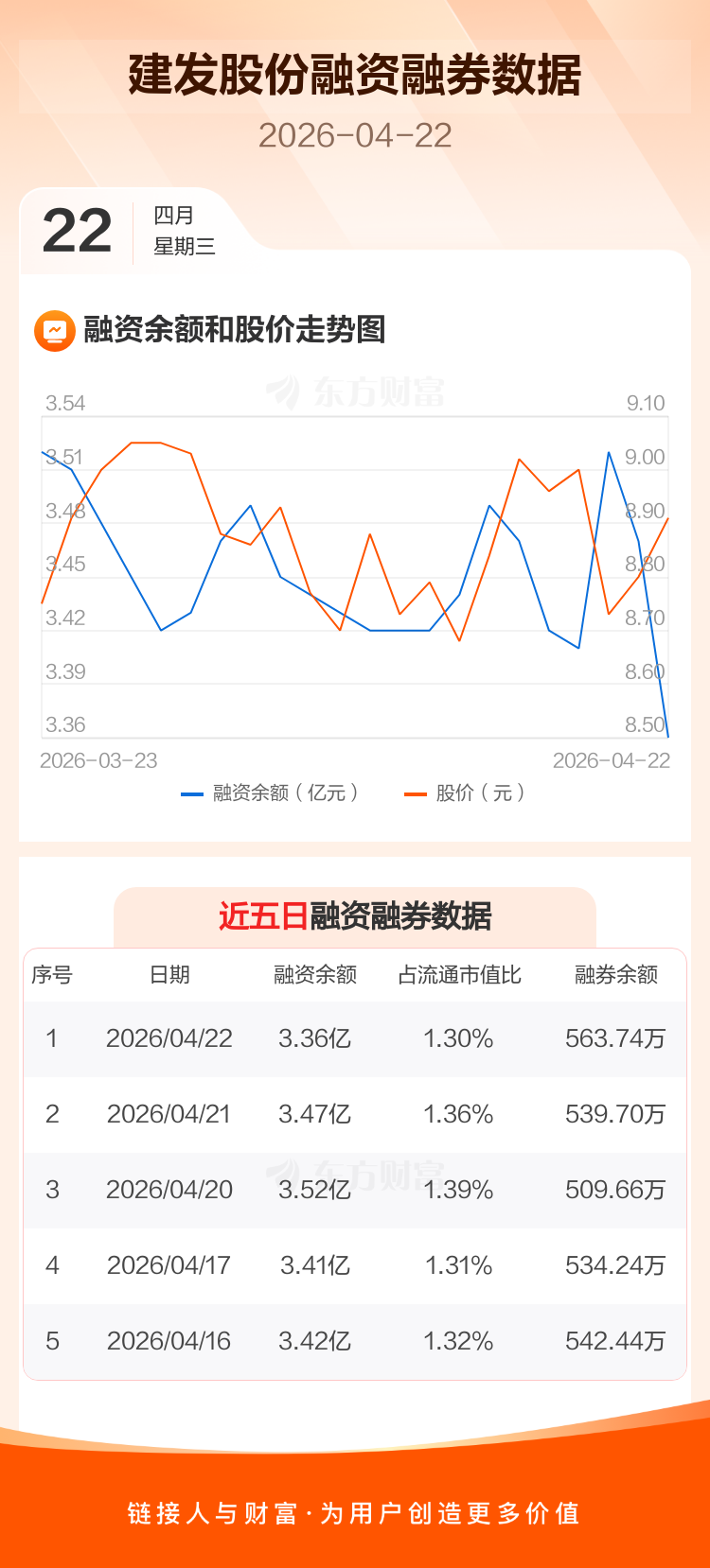 交易所最新数据显示,建发股份于2026年4月22日获融资买入642.87万元,融资偿还1751.92万元,当日融资净偿还1109.06万元。目前,该股融资余额3.36亿,占流通市值比例为1.30%。
