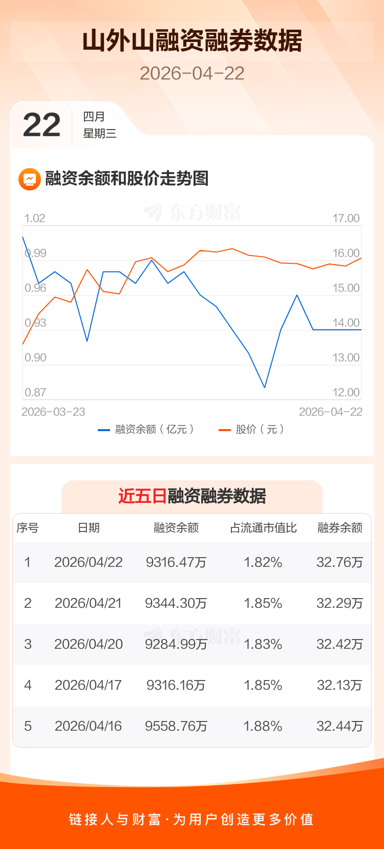 交易所最新数据显示,山外山于2026年4月22日获融资买入392.43万元,融资偿还420.26万元,当日融资净偿还27.84万元。目前,该股融资余额9316.47万,占流通市值比例为1.82%。