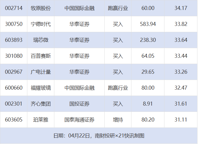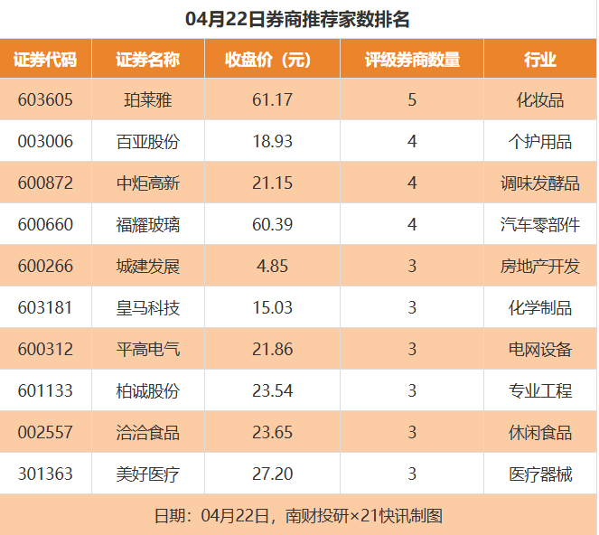 从券商推荐家数来看,4月22日有160家上市公司得到券商推荐,其中珀莱雅获得5家推荐,百亚股份、中炬高新等获得4家推荐。