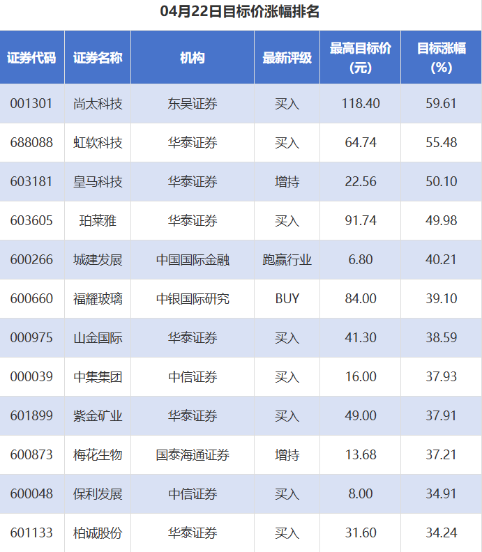 南财投研数据显示,4月22日,券商给予上市公司目标价共83次,按最新收盘价计算,目标价涨幅排名居前的公司有尚太科技、虹软科技、皇马科技,目标价涨幅分别为59.61%、55.48%、50.10%,分别属于电池、IT服务、化学制品行业。