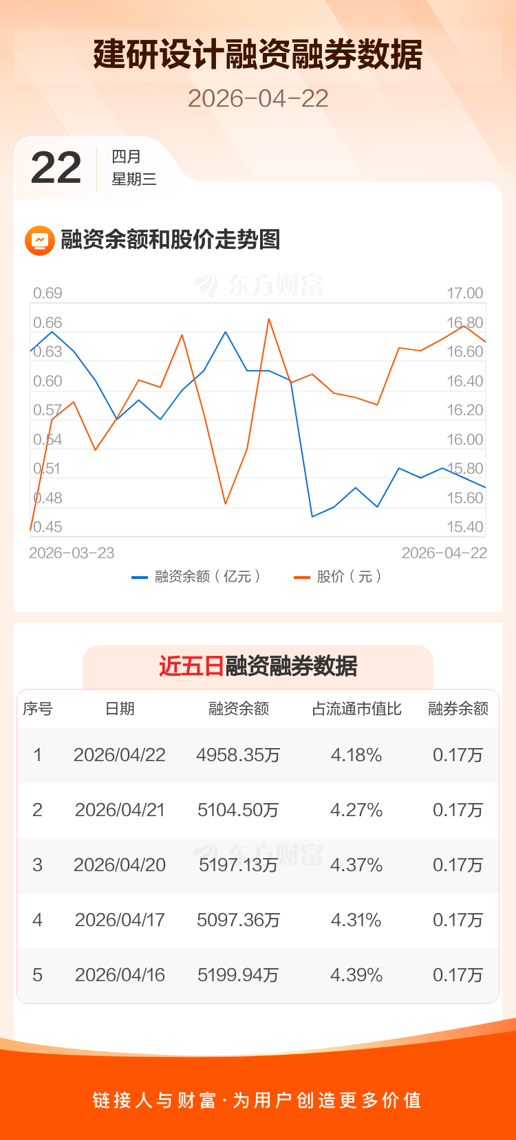 交易所最新数据显示,建研设计于2026年4月22日获融资买入269.25万元,融资偿还415.40万元,当日融资净偿还146.15万元。目前,该股融资余额4958.35万,占流通市值比例为4.18%。