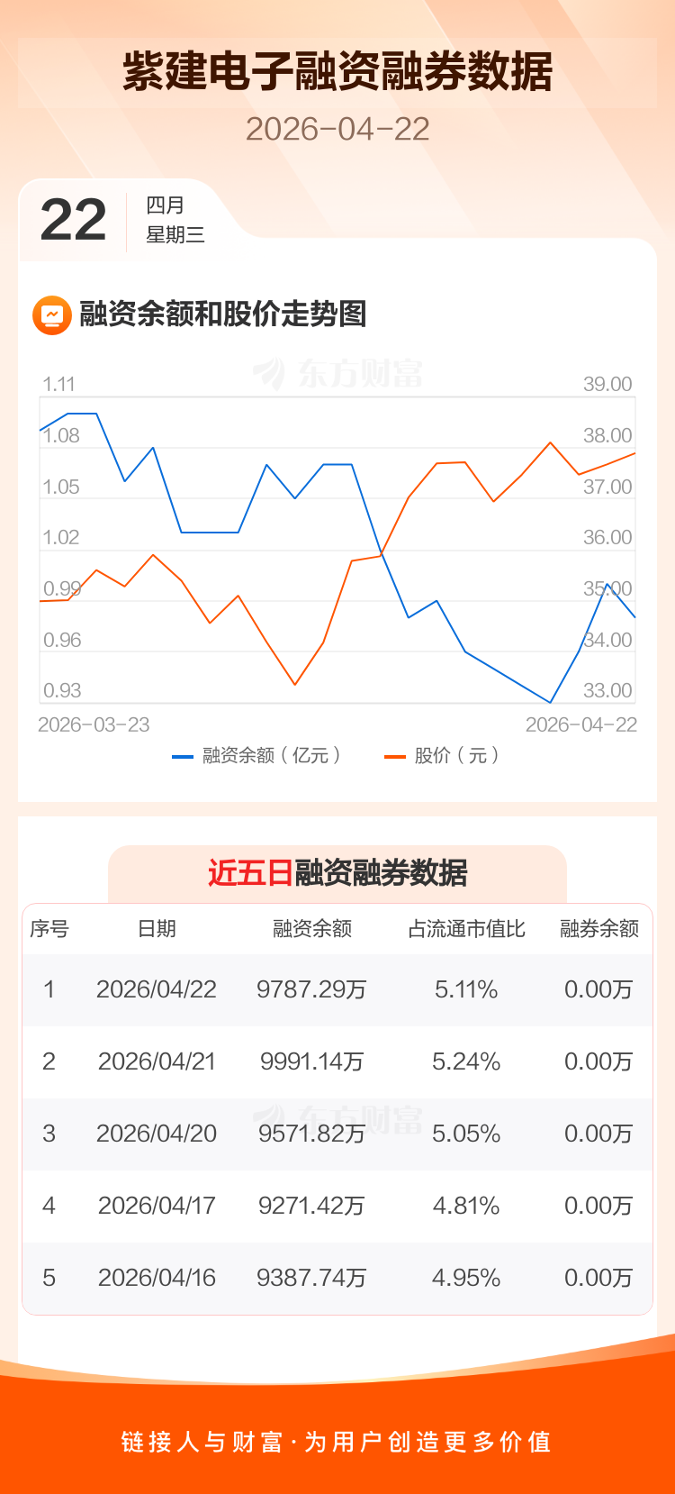 交易所最新数据显示,紫建电子于2026年4月22日获融资买入401.81万元,融资偿还605.66万元,当日融资净偿还203.85万元。目前,该股融资余额9787.29万,占流通市值比例为5.11%。