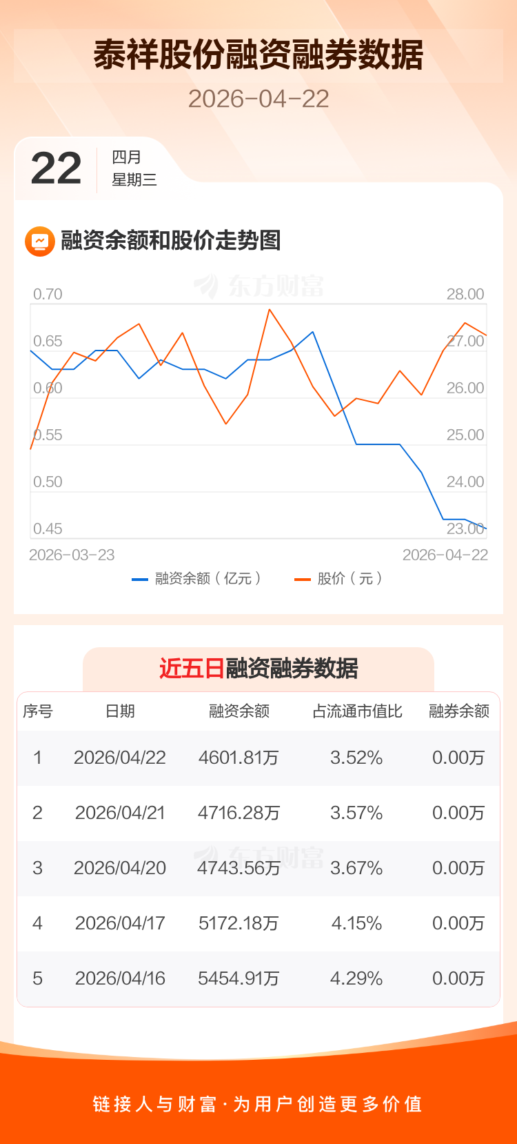 交易所最新数据显示,泰祥股份于2026年4月22日获融资买入197.23万元,融资偿还311.70万元,当日融资净偿还114.47万元。目前,该股融资余额4601.81万,占流通市值比例为3.52%。
