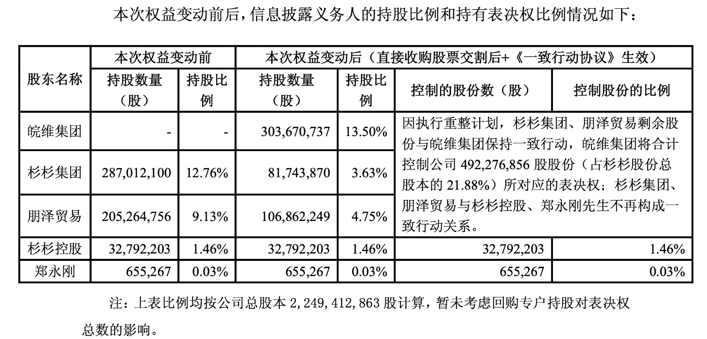 根据重整计划,重整投资人安徽皖维集团有限责任公司(下称“皖维集团”)将通过直接收购股票以及和保留股票一致行动的安排,合计控制债务人持有的21.88%杉杉股份股票的表决权或与债务人达成一致行动。其中,皖维集团所持股份占杉杉股份总股本的13.50%;杉杉集团、朋泽贸易拟将所持杉杉股份剩余的8.38%股份的全部表决权与皖维集团保持一致行动。