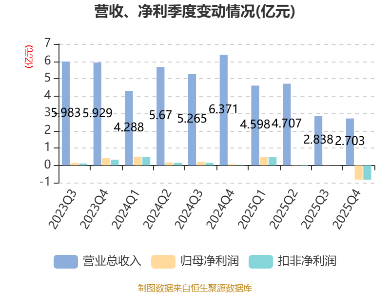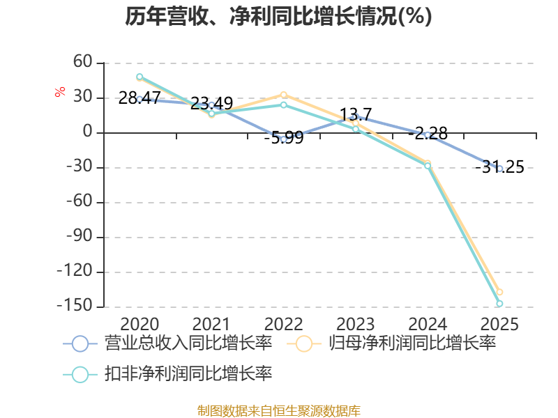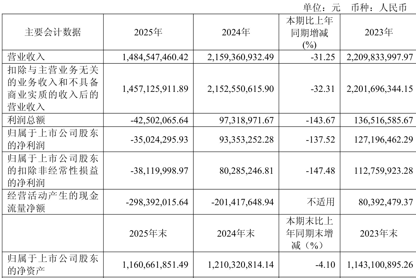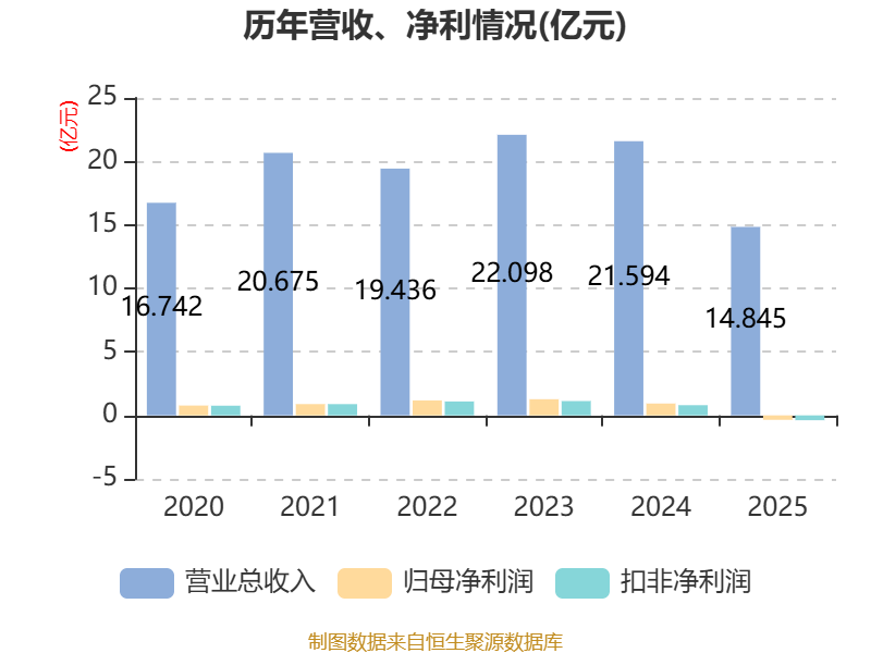 中证智能财讯恒尚节能(603137)4月23日披露2025年年度报告。2025年,公司实现营业总收入14.85亿元,同比下降31.25%;归母净利润亏损3502.43万元,上年同期盈利9335.33万元;扣非净利润亏损3812万元,上年同期盈利8028.52万元;经营活动产生的现金流量净额为-2.98亿元,上年同期为-2.01亿元;报告期内,恒尚节能基本每股收益为-0.19元,加权平均净资产收益率为-2.96%。