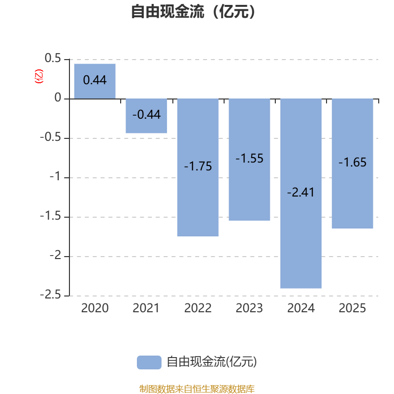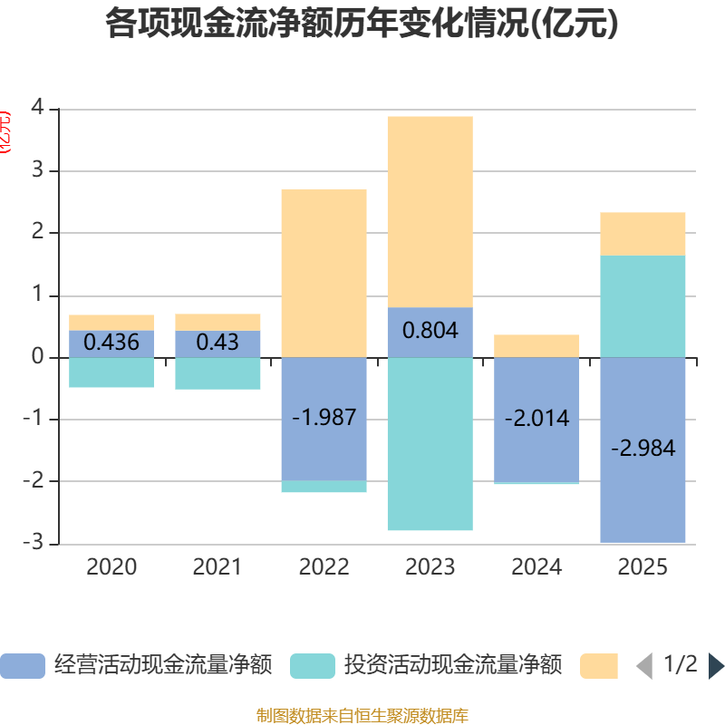 截至2025年,公司经营活动现金流净额为-2.98亿元,同比减少9697.44万元;筹资活动现金流净额6912.5万元,同比增加3280.29万元;投资活动现金流净额1.64亿元,上年同期为-259.81万元。