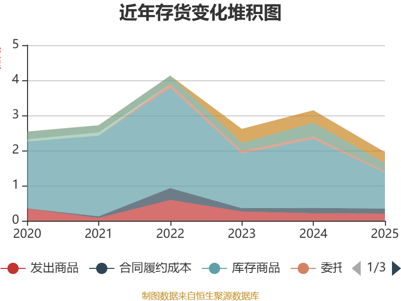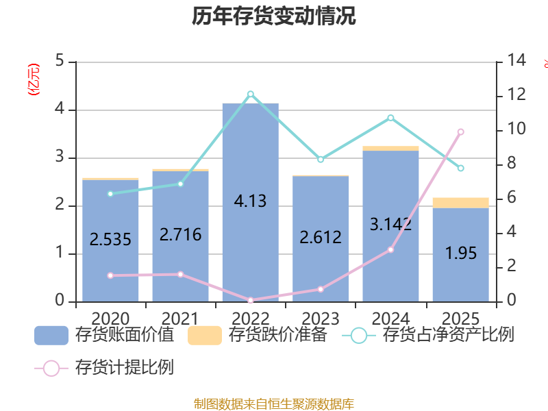 从存货变动来看,截至2025年末,公司存货账面价值为1.95亿元,占净资产的7.78%,较上年末减少1.19亿元。其中,存货跌价准备为2141.69万元,计提比例为9.9%。