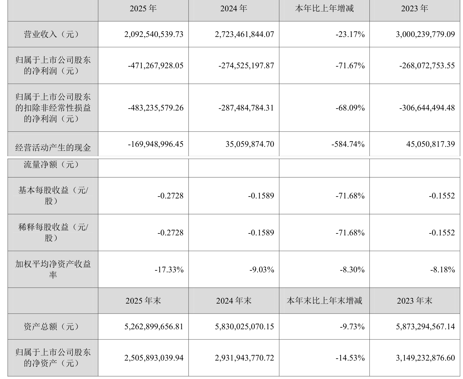 中证智能财讯旋极信息(300324)4月23日披露2025年年度报告。2025年,公司实现营业总收入20.93亿元,同比下降23.17%;归母净利润亏损4.71亿元,上年同期亏损2.75亿元;扣非净利润亏损4.83亿元,上年同期亏损2.87亿元;经营活动产生的现金流量净额为-1.7亿元,上年同期为3505.99万元;报告期内,旋极信息基本每股收益为-0.2728元,加权平均净资产收益率为-17.33%。