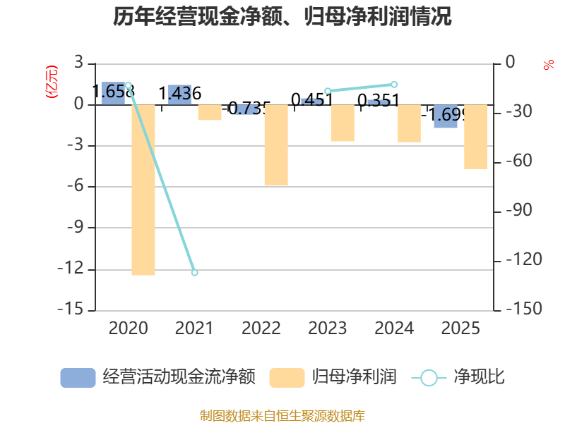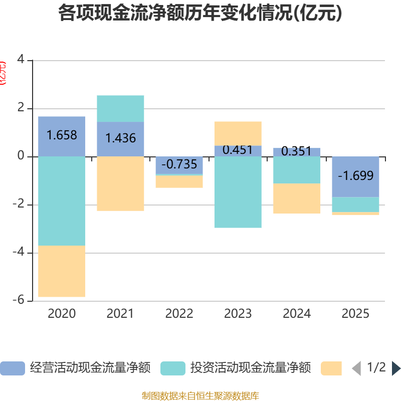 截至2025年,公司经营活动现金流净额为-1.7亿元,同比减少2.05亿元;筹资活动现金流净额-1168.19万元,同比增加1.13亿元;投资活动现金流净额-6201.99万元,上年同期为-1.13亿元。