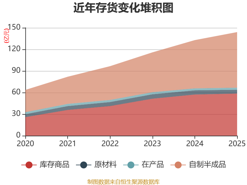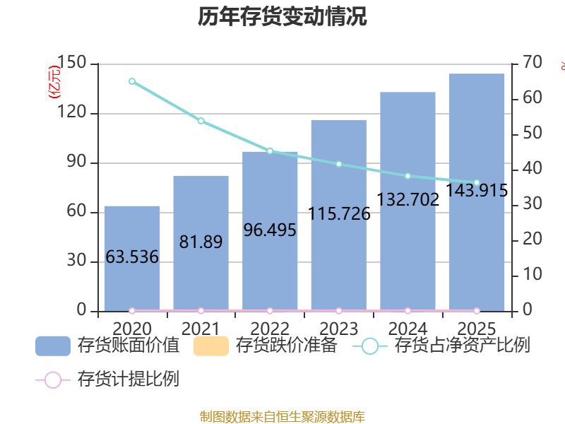 从存货变动来看,截至2025年末,公司存货账面价值为143.92亿元,占净资产的36.31%,较上年末增加11.21亿元。其中,存货跌价准备为417.15万元,计提比例为0.03%。