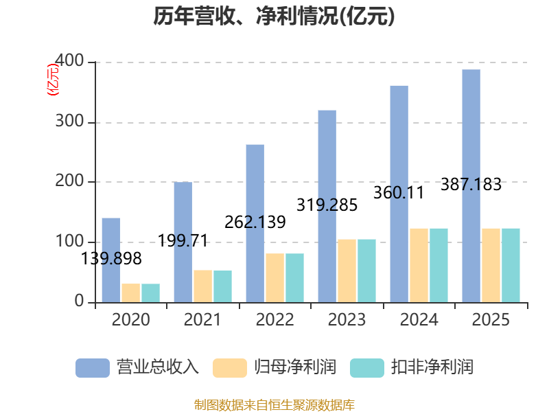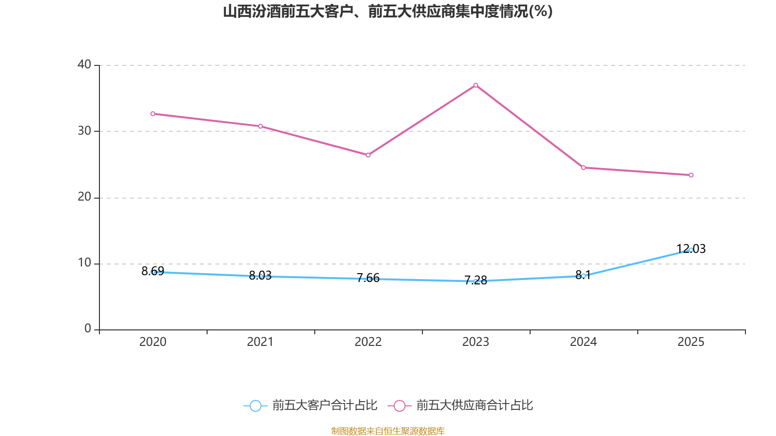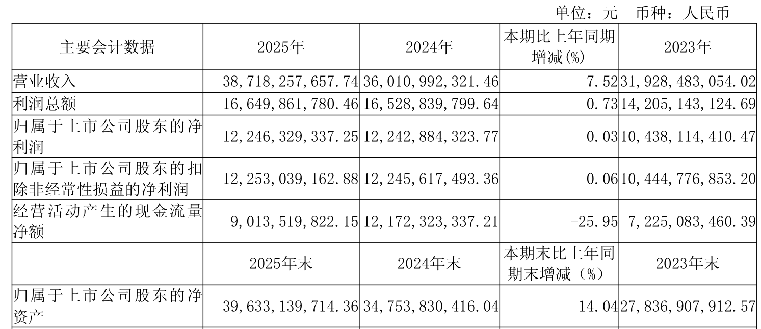中证智能财讯山西汾酒(600809)4月23日披露2025年年度报告。2025年,公司实现营业总收入387.18亿元,同比增长7.52%;归母净利润122.46亿元,同比增长0.03%;扣非净利润122.53亿元,同比增长0.06%;经营活动产生的现金流量净额为90.14亿元,同比下降25.95%;报告期内,山西汾酒基本每股收益为10.0383元,加权平均净资产收益率为33.48%。公司2025年度分配预案为:拟向全体股东每10股派现65.6元(含税)。
