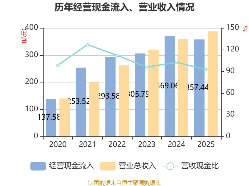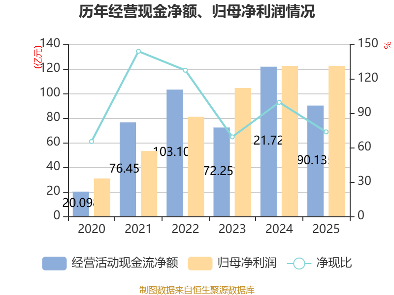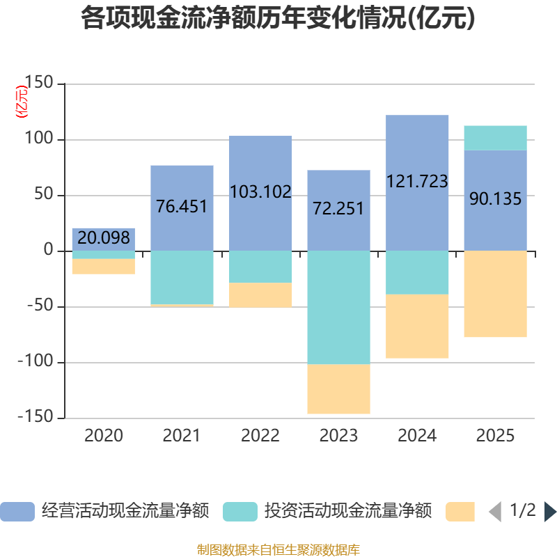 截至2025年,公司经营活动现金流净额为90.14亿元,同比下降25.95%;筹资活动现金流净额-77.62亿元,同比减少20.29亿元;投资活动现金流净额22.01亿元,上年同期为-39.29亿元。