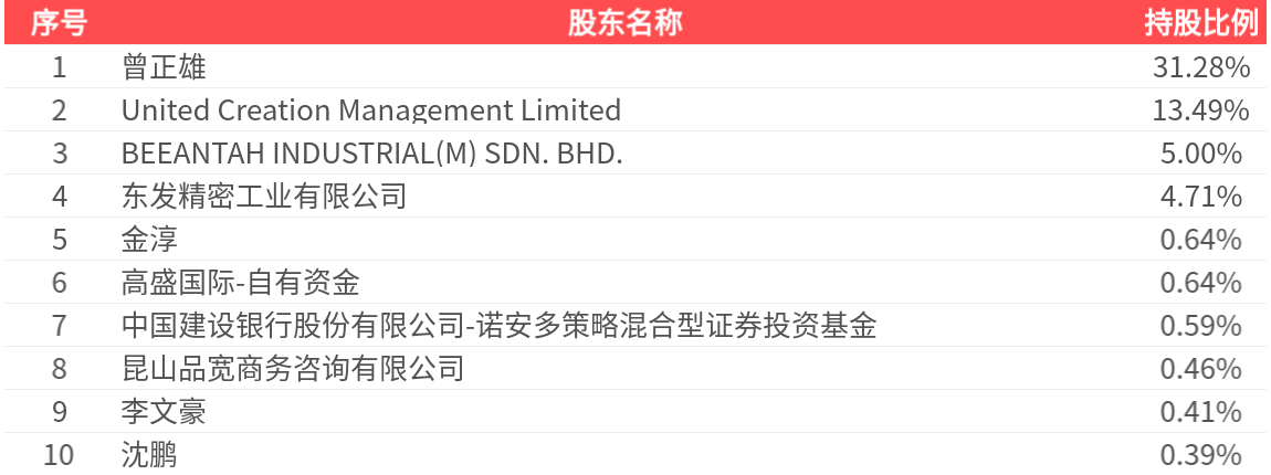 公司股东户数为1.31万户,前十大股东持股数量为7684.05万股,占总股本比例为57.63%,前十大股东持股情况如下: