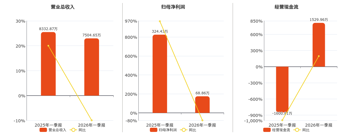 公司营业总收入为7504.65万元,较去年同报告期营业总收入减少828.22万元,同比较去年同期下降9.94%。归母净利润为68.86万元,较去年同报告期归母净利润减少255.57万元,同比较去年同期下降78.77%。经营活动现金净流入为1529.96万元。