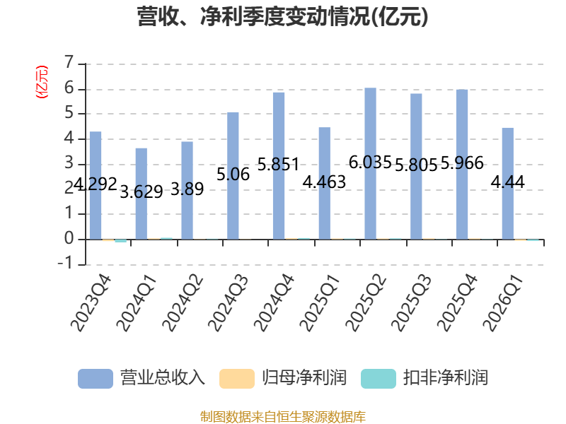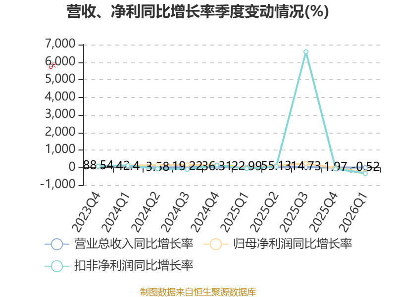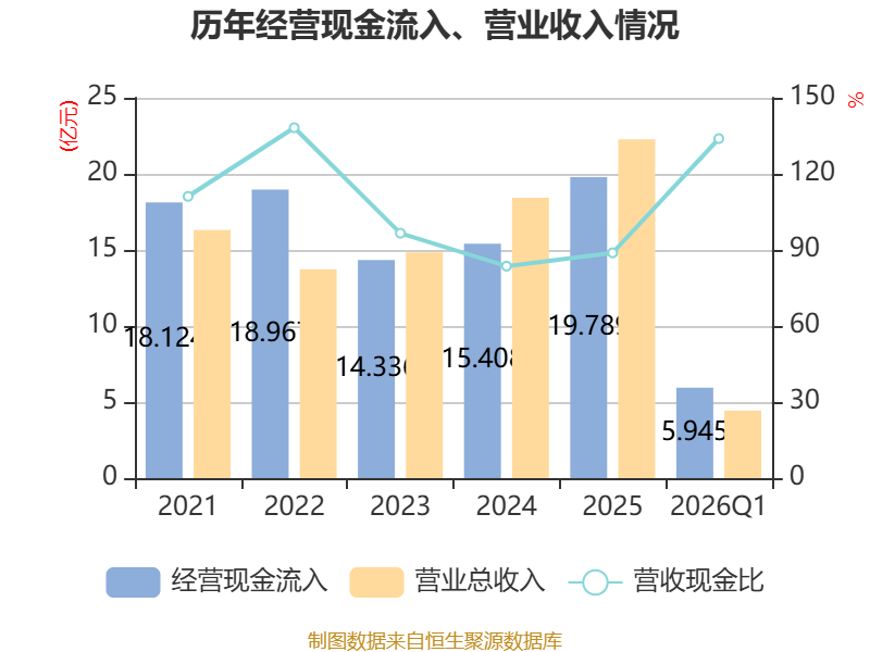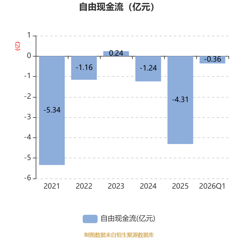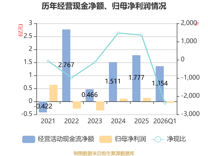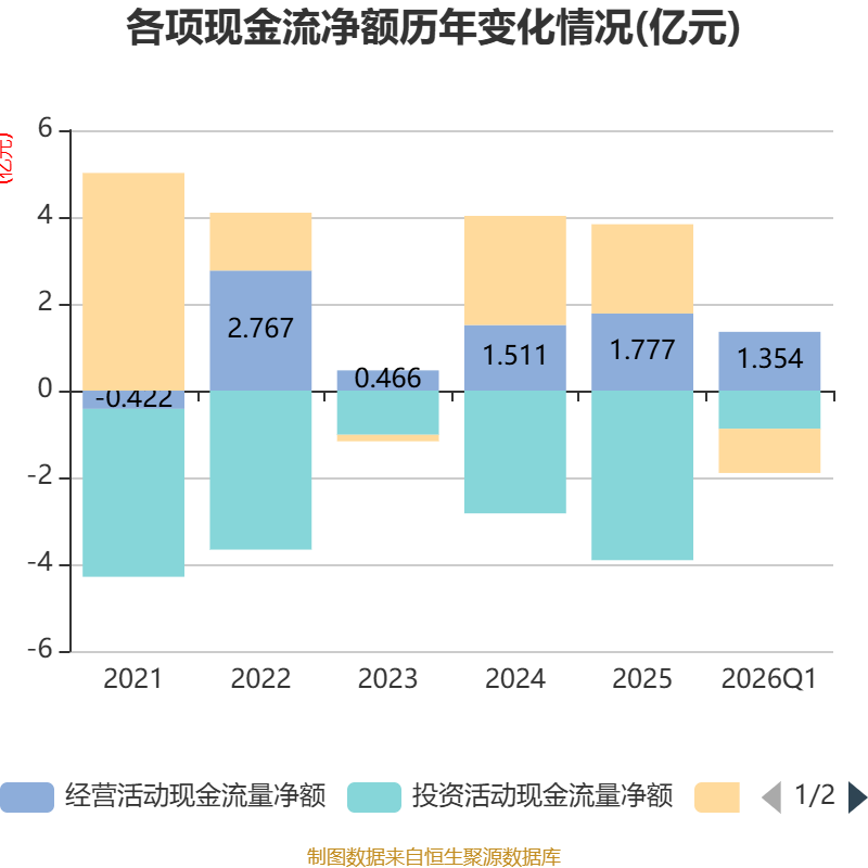 截至2026年一季度末,公司经营活动现金流净额为1.35亿元,同比增长49.55%;筹资活动现金流净额-1.02亿元,同比减少1.02亿元;投资活动现金流净额-8790.77万元,上年同期为-9347.02万元。